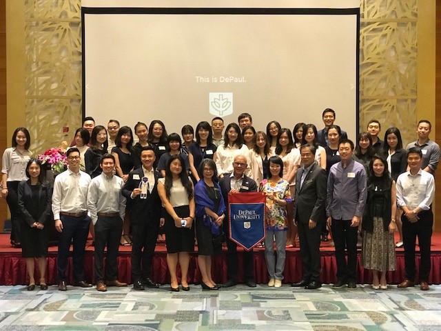 In early October, A. Gabriel Esteban, PhD, president of DePaul University, and his wife, Josephine, traveled to China to visit with alumni living in Beijing, Shanghai and Shenzhen. This was the first time a sitting DePaul president has visited China in an official capacity, and Dr. Esteban was happy to share updates on the university with hundreds of alumni during his week abroad. University Trustees Jessica Sarowitz (LAS ’91) and George (LAS ’74) and Tanya Ruff accompanied the Estebans and helped to spread the DePaul cheer!